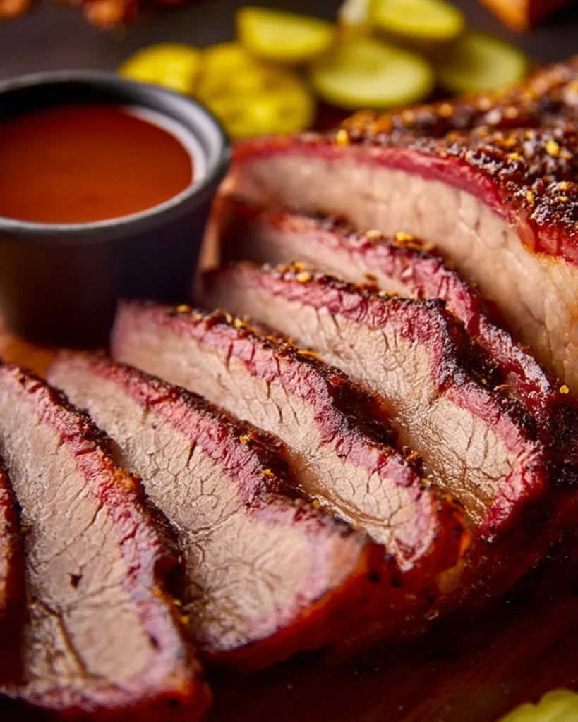 Serve slices on warm plates. Add a small spoon of sauce on the side. For a classic meal, add potato salad, pickles, and a simple green salad. The smoky, salty meat goes well with sweet or tangy sides. For a casual meal, pile slices on soft rolls and add pickles and slaw for a brisket sandwich.
